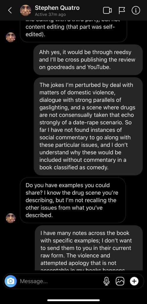 Me: “Ahh yes, it would be through reedsy and I’ll be cross publishing the review on goodreads and YouTube. The jokes I’m perturbed by deal with matters of domestic violence, dialogue with strong parallels of gaslighting, and a scene where drugs are not consentually taken that echo strongly of a date-rape scenario. So far I have not found instances of social commentary to go along with these particular issues, and I don’t understand why these would be included without commentary in a book classified as comedy.”