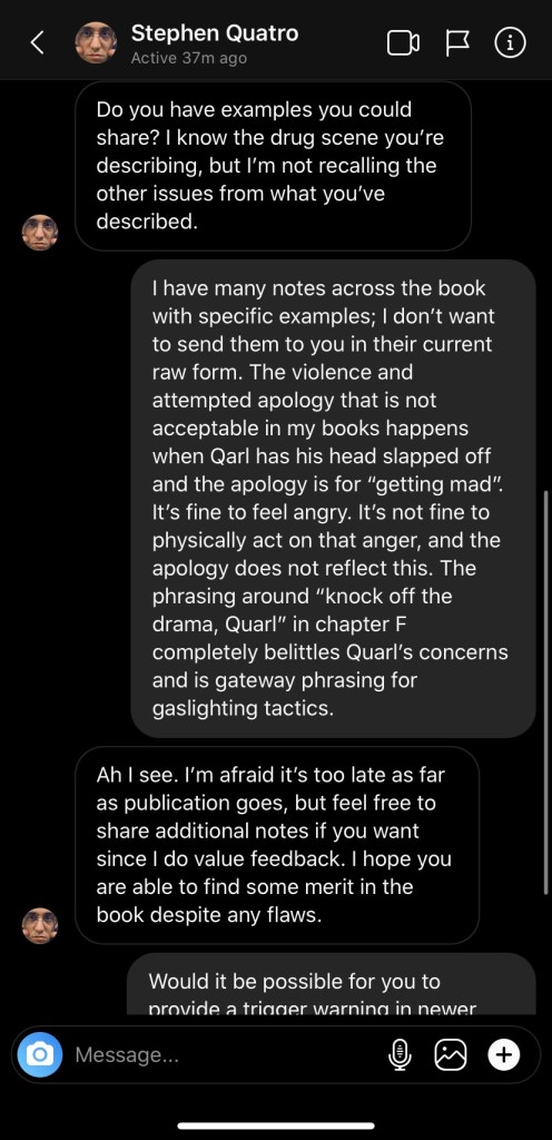 This book has been through a copy and a line editor. I have no copy edit notes and very few line editing notes. What this book didn’t have was a content editor AND IT SHOWS. Before finishing the book and attempting to organize my notes, I reached out to the author directly on Instagram to try to give him my notes before this book was released since, according to Reedsy, the book wouldn’t be released until August 30th, 2020. As it turns out, the book has already been published, and the author did not make any confirmable commitments to at least provide the trigger warnings that this book desperately needs. On one hand I’m glad the author didn’t immediately become defensive to my criticism, but I would still like to see a commitment to either 1) pull the book from shelves and implement some content edits (which based on our brief conversation isn’t going to happen) or 2) provide trigger warnings to new potential buyers before the point of sale. I’ll insert screenshots of the conversation in my blog post and also provide a transcription of those screenshots here for you to interpret [there are minute spoilers in this section that do not spoil the overall story in this section]: