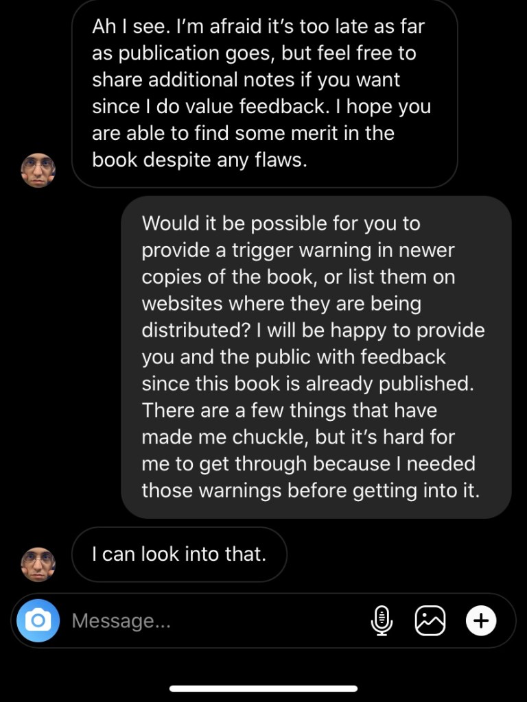 Me: “Would it be possible for you to provide a trigger warning in newer copies of the book, or list them on websites where they are being distributed? I will be happy to provide you and the public with feedback since this book is already published. There are a few things that have made me chuckle, but it’s hard for me to get through because I needed those warnings before getting into it.”